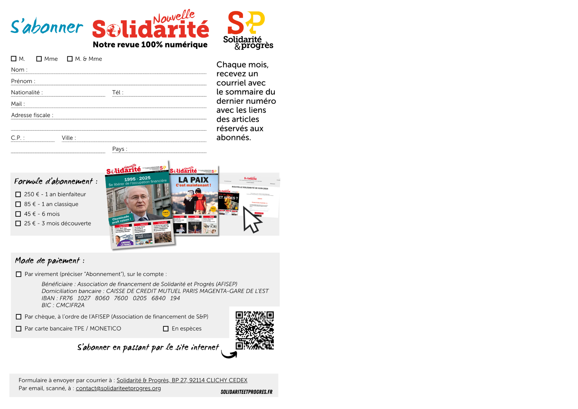 Et en envoyant à l’adresse sebastiendrochon@solidariteetprogres.org, vos coordonnées (Nom, prénom, adresse, email, téléphone) , avec pour objet du mail : "Abonnement à Nouvelle Solidarité".