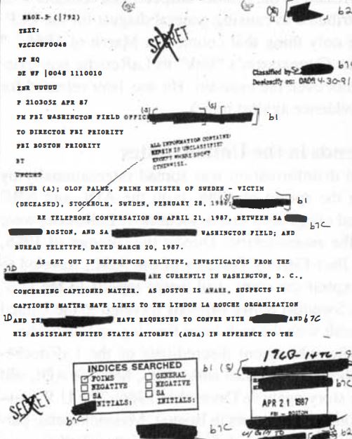 Or, parmi les suspects, à l’époque, hormis le Parti des travailleurs du Kurdistan (PKK) et les services secrets sud-africains (Palme étant un farouche opposant de l’apartheid), figurait l’EAP (Parti ouvrier européen), branche suédoise du mouvement international de l’économiste américain Lyndon LaRouche (1922-2019). La police suédoise avait auditionné, le 8 mars, un certain Victor Gunnarsson, qui affirmait avoir signé une pétition de l’EAP, parti dont il n’était toutefois pas membre. Gunnarsson fut d’ailleurs mis hors de cause par la suite.