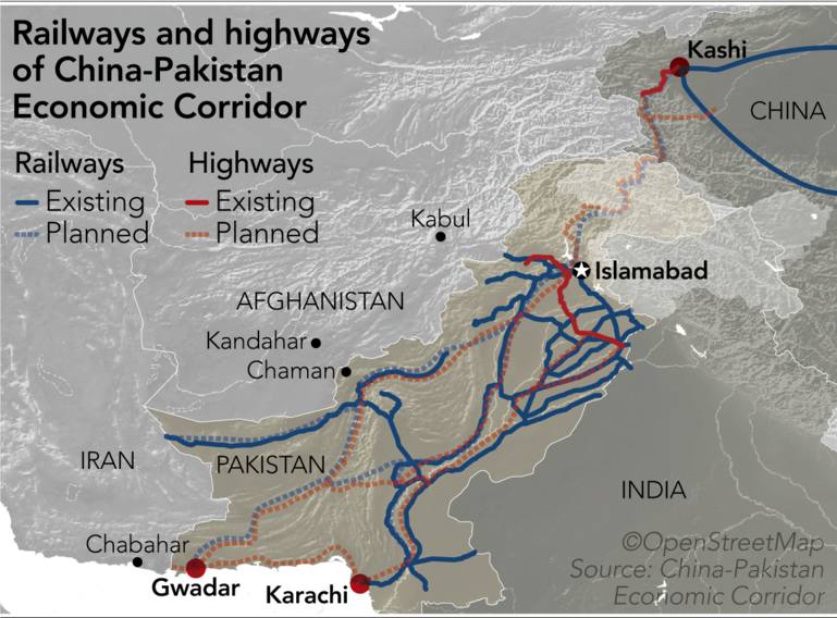 Emancipé de l’emprise américaine, le gouvernement du président Ashraf Ghani multiplie les contacts avec Moscou et Beijing. Le 4 juillet, Ghani s’est entretenu par téléphone avec Vladimir Poutine, et le lendemain, le conseiller afghan à la sécurité nationale s’est rendu à Moscou. Mais la presse britannique s’inquiète surtout à l’idée de voir l’Afghanistan rejoindre l’Initiative chinoise de la ceinture et la Route (ICR) – les Nouvelles Routes de la soie lancées en 2013 par Xi Jinping. Le Daily Beast cite notamment une source anonyme proche du gouvernement afghan rapportant que Kaboul se tourne vers la Chine en vue d’une extension du Corridor économique Chine-Pakistan (le CPEC, voir ci-contre) – qui relie la ville de Kashgar, dans l’Ouest de la Chine, au port de Gwadar, au Sud du Pakistan, en suivant une voie parallèle à la frontière afghano-pakistanaise. L’autoroute construite dans ce corridor pourrait ainsi être prolongée jusqu’à Kaboul. « Les autorités afghanes et chinoises sont actuellement engagées dans des pourparlers pour réaliser une route entre Peshawar et Kaboul, ce qui signifierait l’adhésion formelle de l’Afghanistan au CPEC », rapporte une autre source.