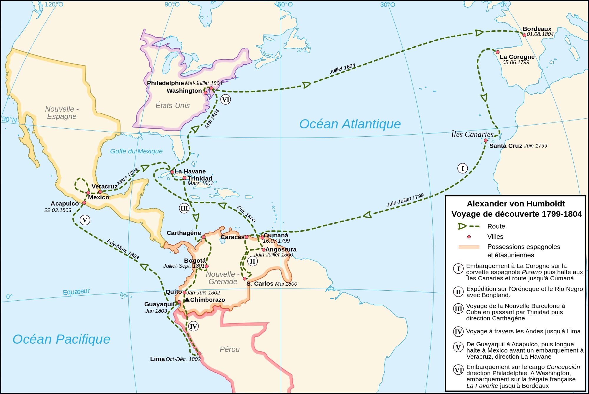 Humboldt rejoignit même l’équipe géodésique française qui travaillait sur les mesures de triangulation le long du méridien Dunkerque-Barcelone (passant par Paris), et qui servirent plus tard à établir la longueur du mètre (1/40 000 000e du méridien de Paris).