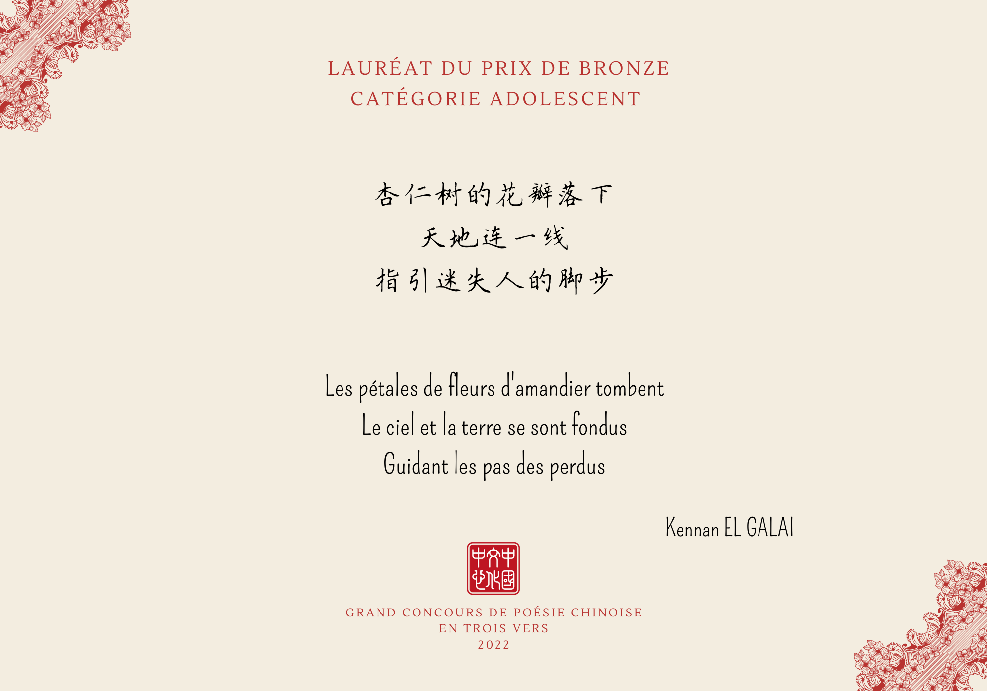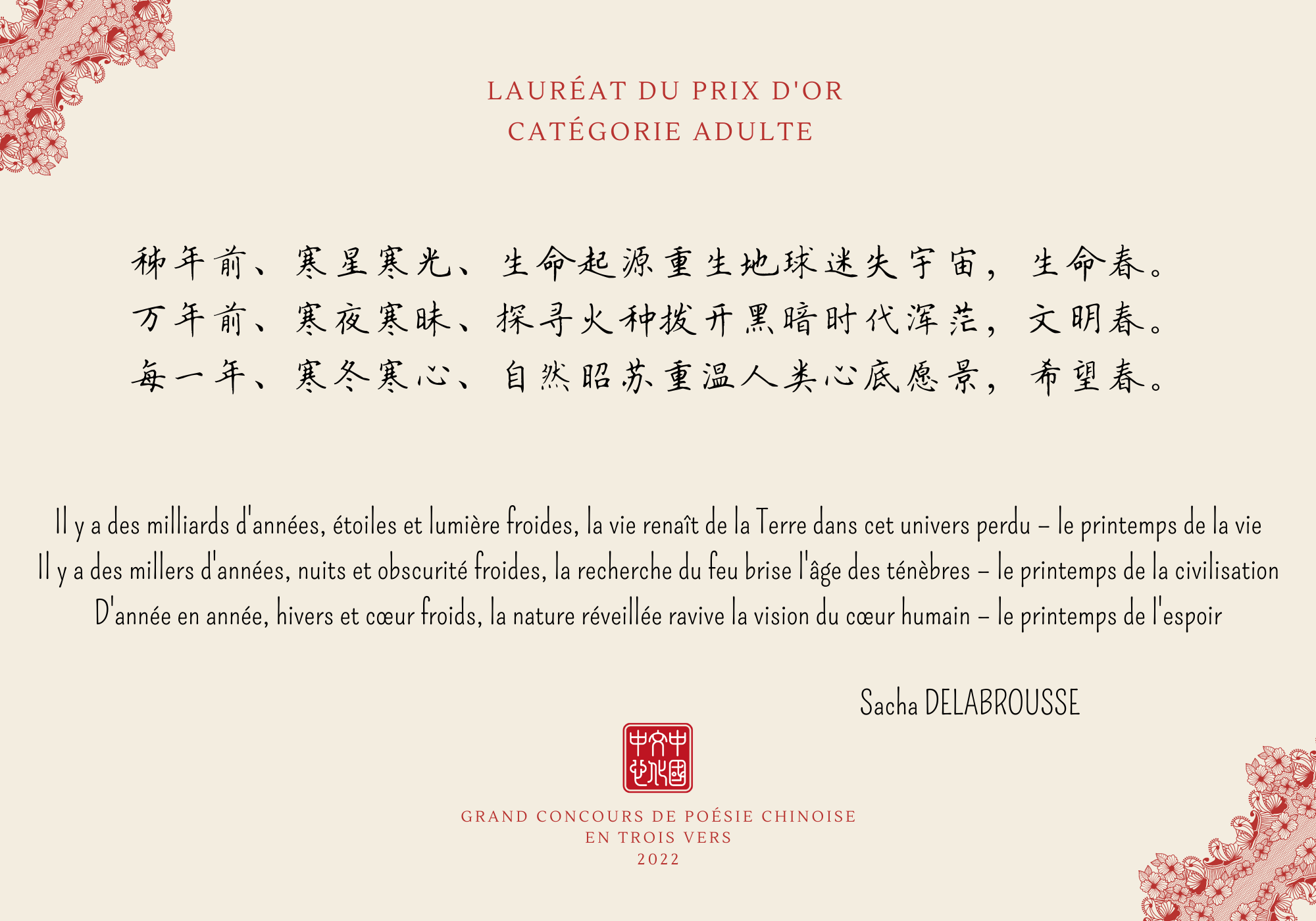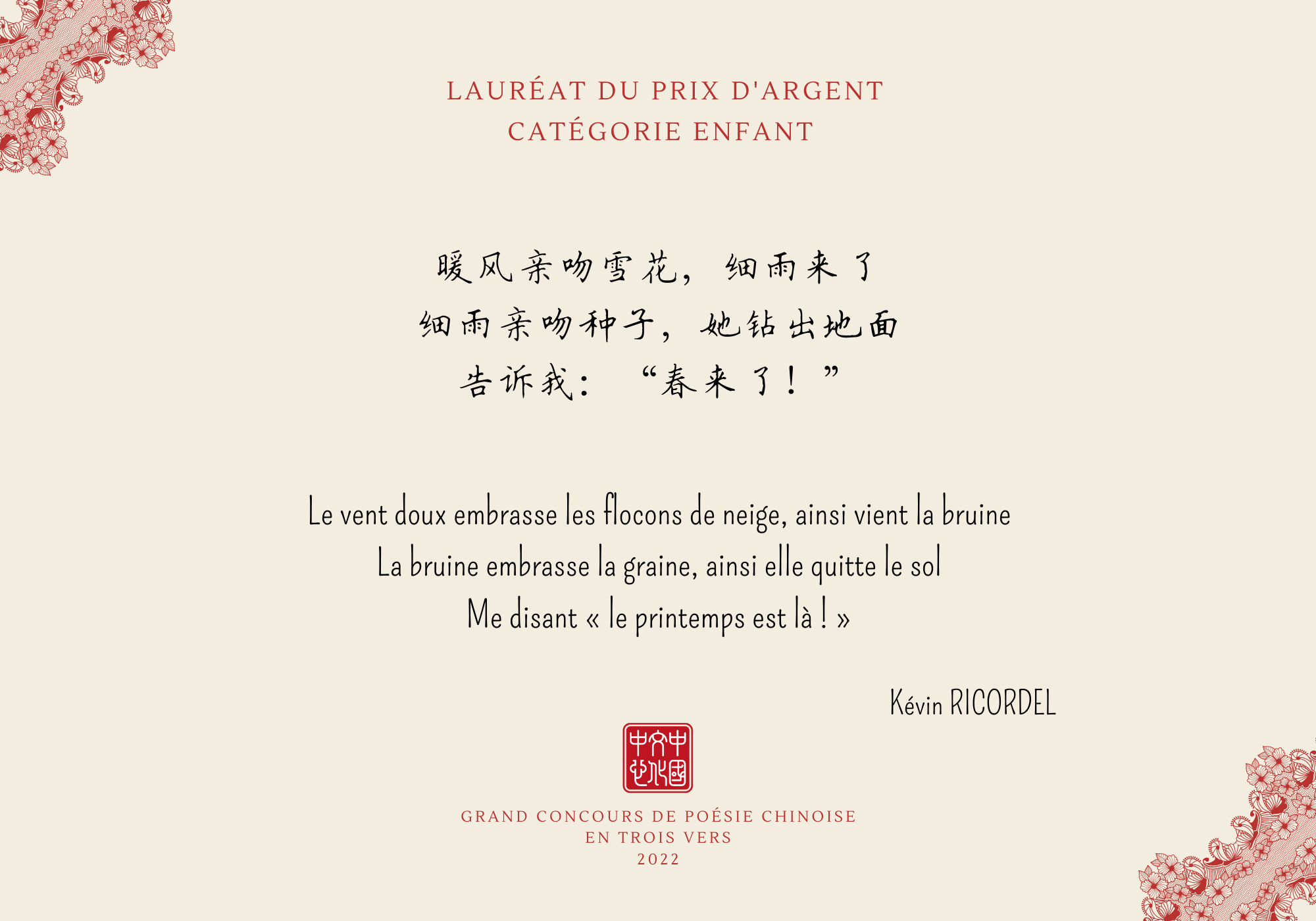 Organisée au lendemain de la « Journée internationale de la langue chinoise » de l’ONU, cette rencontre fut aussi l’occasion de la remise des prix aux lauréats du Concours de poésie organisé par l’Ambassade de Chine. Les concurrents devaient écrire sur un thème très prisé en Chine, le printemps, mais en utilisant la forme occidentale de trois vers. Sur 210 participants, vingt-sept enfants, adolescents et adultes ont été primés. Les poèmes, écrits en chinois mais traduits en français, étaient consultables sur place. (voir un choix de 3 poèmes primés à la fin de ce texte).