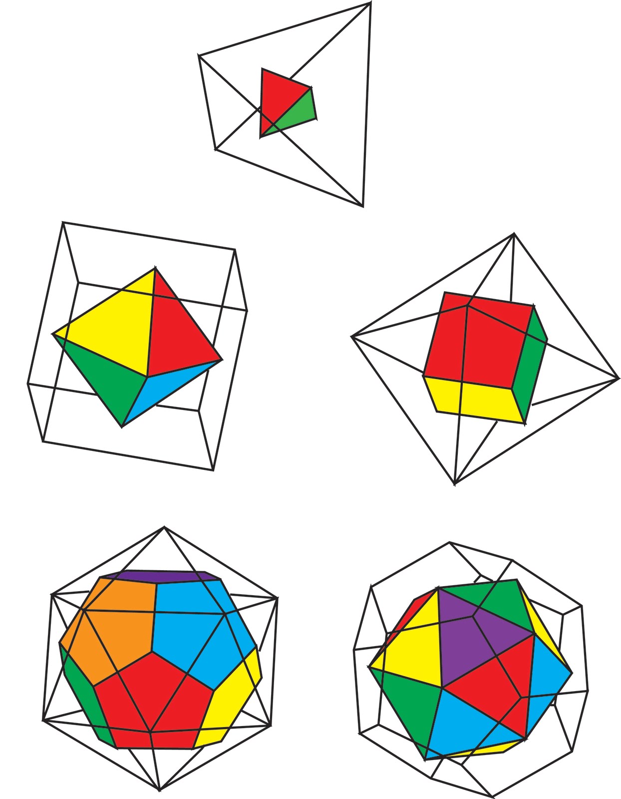 Le sujet principal des travaux sur la géométrie de Pacioli et de Léonard, a porté sur la maîtrise du principe des cinq solides platoniciens extrait du Timée [6] de Platon (environ 427-347 av. J-C). C’est la preuve que dans l’espace visible (« Euclidien »), seules cinq espèces de polyèdres réguliers peuvent être construites par les méthodes de la géométrie synthétique.
