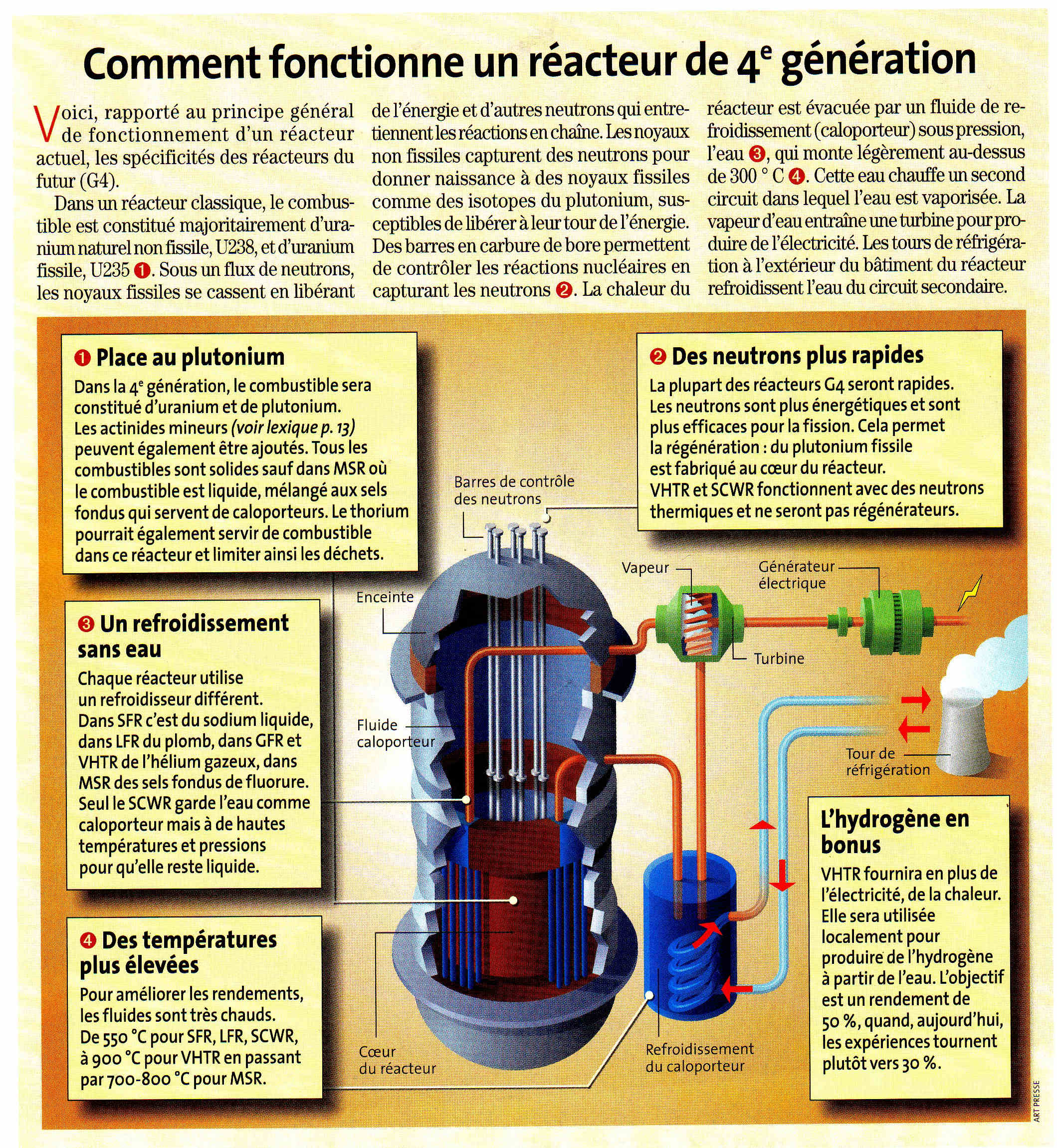 En France, c’est le président Jacques Chirac, qui, en janvier 2006, charge le CEA d’étudier un projet de réacteur de IVe génération. La France a arrêté alors son choix sur la filière à neutrons rapides (RNR) utilisant le sodium, et non plus l’eau, comme caloporteur (généralement un liquide permettant de transmettre la chaleur). L’utilisation de ce métal a l’avantage de moins freiner les neutrons que l’eau et de ne pas corroder les éléments en acier du réacteur.