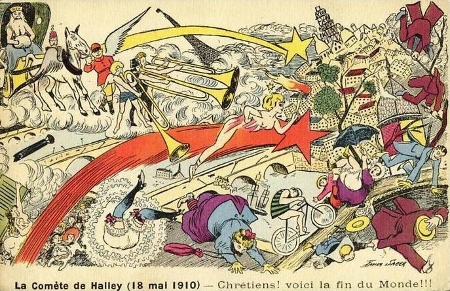 C’est seulement en 1910 que l’approche de la comète de Halley causa, pour la première fois, un vent de panique, se propageant à l’ensemble du monde civilisé. Ironiquement, ceci était le résultat direct des accomplissements de la science : pour la première fois, une analyse spectrale de la queue de la comète fut effectuée, révélant la présence de cyanogène très toxique, ainsi que de monoxyde de carbone. Il était connu que la Terre allait passer le 18 mai 1910 dans la queue de la comète, provoquant ainsi une « hystérie de la comète ». Nombreux étaient ceux qui attendaient la fin du monde. On se précipita sur des « pilules anti-comète », des « parapluies anti-comète ». Le célèbre auteur anglais Conan Doyle, inspiré par cette folie, écrivit l’un des meilleurs romans de science fiction, The Poison Belt, dans lequel la Terre traverse une « ceinture d’éther toxique » et l’humanité se trouve immergée pendant plusieurs jours dans un profond sommeil.