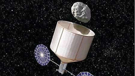 Le chef de Roscosmos, Vladimir Popovkine, a déclaré il y a dix jours que la NASA avait proposé à la Russie un projet conjoint consistant à capturer et transporter jusqu’à l’orbite lunaire un petit astéroïde (500 tonnes environ). L’idée est de le tracter jusqu’à l’orbite lunaire, afin qu’il puisse être étudié par des robots et éventuellement dans le cours de missions habitées. Il semble toutefois, d’après un article d’Aviation Week, qu’il ne s’agisse pas d’un projet approuvé mais seulement d’une initiative pour laquelle la NASA cherche à obtenir une allocation budgétaire de 100 millions de dollars. Le projet, mis de l’avant par le Keck Institute for Space Studies, impliquerait l’usage d’un « sac » spécial pour capturer l’objet, qui serait ensuite remorqué vers une orbite elliptique lunaire ou un point de Lagrange du système Terre-Lune. Si ce projet était approuvé, il pourrait coûter jusqu’à 2,65 milliards de dollars. Il pourrait ressembler à la figure ci-contre.
