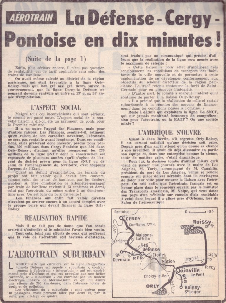 En France, le fameux Aérotrain de l’ingénieur Jean Bertin, « flottant » sur des coussins d’air, ce véhicule sans roue pouvait atteindre plus de 400 km/h en évoluant sur une simple voie en béton surélevée sur pylônes ;