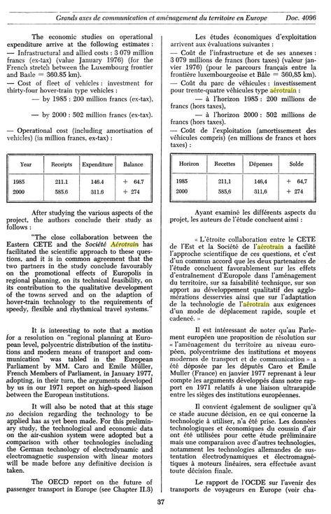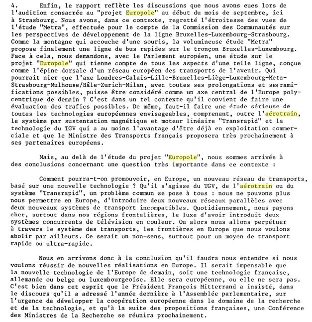 Le 6 juin 1973, le Monde relate les propos du ministre allemand de la Recherche, M. Emhke, en visite à Paris pour y rencontrer son homologue M. Charbonnel. Pour le ministre allemand, « Il faut en arriver à une solution supranationale » car, dixit Le Monde, « il s’inquiète, à juste raison, de la diversité des nouveaux moyens de transport à grande vitesse proposés en Europe : turbotrains en France, en Grande Bretagne, en Allemagne ; coussin d’air en France (la Grande Bretagne a, il y a quelques semaines, abandonné ses études de trains à coussin d’air), suspension magnétique en Allemagne. Lorsqu’il s’agirait d’établir, d’ici quelques années, un réseau européen de liaisons nouvelles à 400 à 500 km/h, chaque pays risque, si l’on n’y prend pas garde, d’adopter une solution technique qui lui soit propre, ce qui aurait pour effet de gêner considérablement le trafic de passagers et de marchandises en Europe. M. Emhke propose une coopération pour tenter d’éviter que la France n’adopte les trains à coussin d’air tandis que l’Allemagne adopterait les trains à coussin magnétique. Il suggère que les deux démarches soient menées simultanément : d’abord se mettre d’accord sur le tracé du futur réseau, ensuite continuer le développement des nouveaux moyens de transport et faire une comparaison qui permette de choisir le meilleur système. »