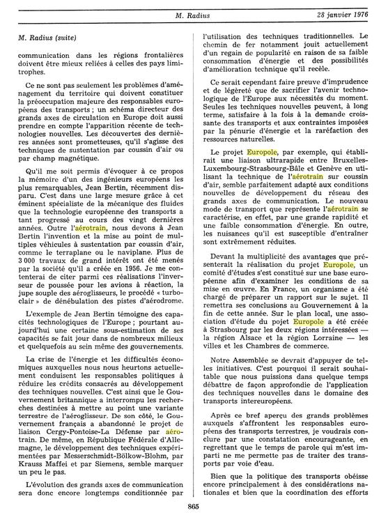D’abord, le 28 janvier 1976, l’intervention du député strasbourgeois René Radius qui rend un hommage marquant au travail de l’ingénieur Jean Bertin, figure emblématique de l’esprit d’inventivité européenne :