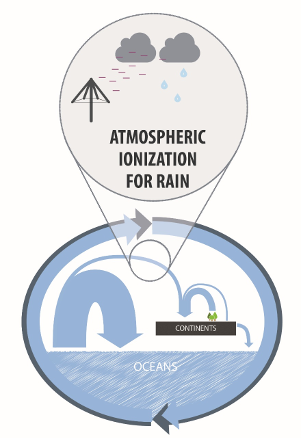 Les systèmes d’ionisation de l’air par des stations au sol peuvent accroître le taux de condensation et de précipitation de la vapeur atmosphérique. En temps normal ,10 % de l’évaporation des océans tombe sur la terre (le reste tombe directement dans la mer) ; ces 10 % sont cependant très mal répartis géographiquement et dans le temps.
