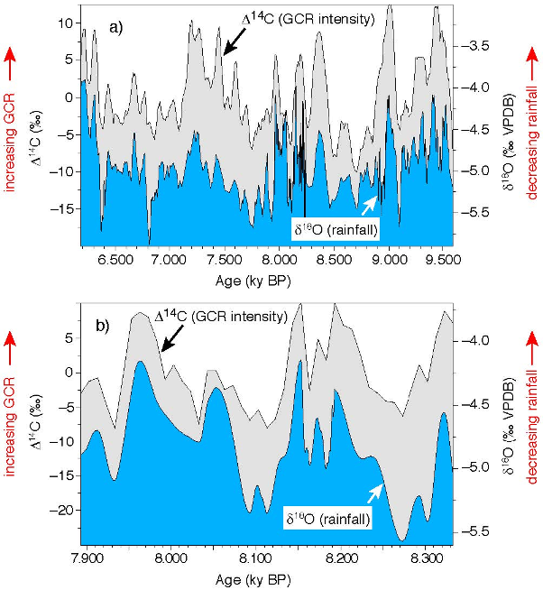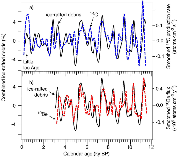 Par exemple, dans cette étude nous voyons que les changements climatiques, mesurés par le débit des glaces dans l’Atlantique nord, correspondent très bien au taux de rayonnement galactique parvenant au sol. Cette étude montre une étroite relation depuis 12 000 ans.