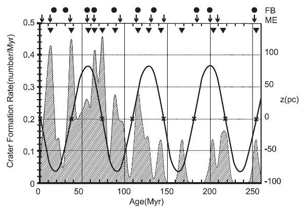 29.5 - 31 Myr “Ethiopian and Yemen traps” 54 - 57 Myr “N. Atlantic Tertiary Volc. Prov.” "Le disque galactique de matière noire et les cycles potentiels ayant in impact extraterrestre" “Disc dark matter in the Galaxy and potential cycles of extraterrestrial impacts, mass extinctions and geological events,” Michael R. Rampino, February 18, 2015, Monthly Notices of the Royal Astronomical Society, Vol. 448, Issue 2. |
