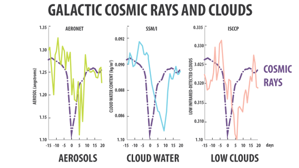 Alors que nous ne nous sommes intéressés qu’aux variations à long terme, voyons leur expression dans un temps bien plus court, de l’ordre de la journée. Lors de baisses soudaines des flux galactiques dans notre atmosphère, nommées « dépressions de Forebush », le taux d’ionisation chute et les mesures correspondantes de la condensation de la vapeur atmosphérique suivent.