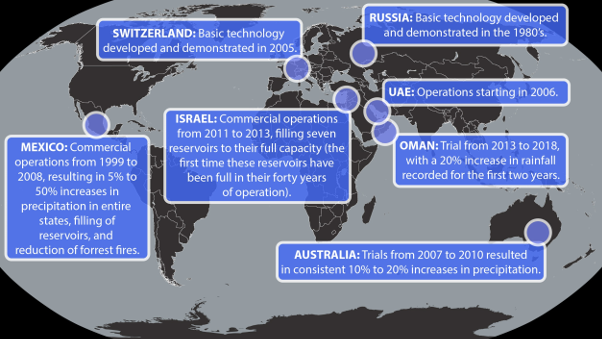 L’essai d’Oman est un exemple mené par les australiens ; il est évalué indépendamment par un institut de l’Université de Wollongong, l’Institut national pour la recherche statistique appliquée. Des essais semblables ont été menés en Australie, et depuis quelques années d’autres sont en cours avec de semblables succès au Mexique et en Israël. L’objectif est de remplir des barrages ou de réduire les incendies de forêts.