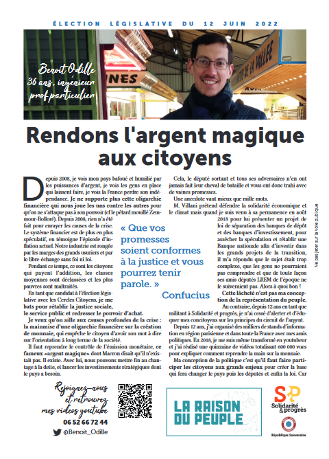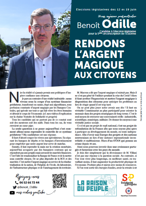 Ainsi, je vous indique que je voterai Cédric Villani (NUPES) au second tour, mais que je serai toujours "dans sa roue" pour qu’il défende la séparation bancaire, la constitution d’une Banque Nationale, et qu’il abandonne la décroissance au profit de la science qu’il aime tant.
