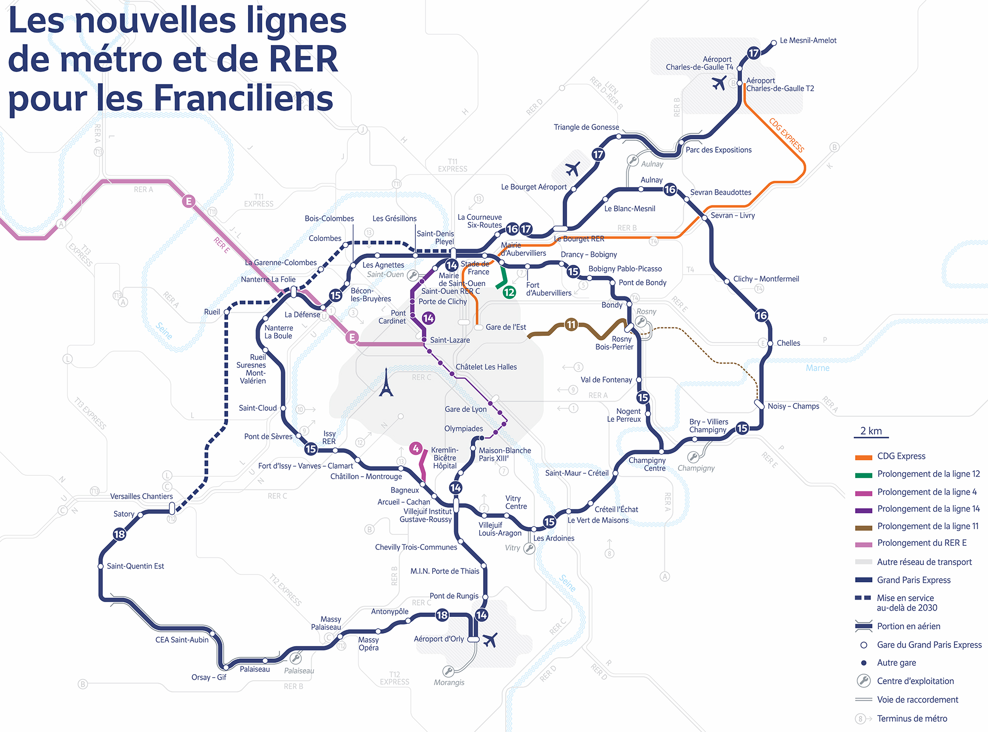 Autre chantier gigantesque (38,5 milliards d’euro) qui augmenterait le nombre de km du métro parisien de 200 à 400.