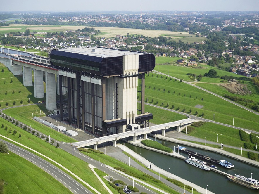 C’est le constat de Vanessa Krins, de l’Institut du patrimoine wallon. En Belgique, une fois que les équipements du canal du Centre, permettant le transport du charbon essentiel à l’industrie belge, se révélèrent obsolètes, le pays fit construire un « nouveau canal du Centre » au grand gabarit, inauguré en 2002 et équipé de l’ascenseur funiculaire de Strépy-Thieu, le plus grand ascenseur à bateaux du monde, permettant de franchir une dénivellation de 73,15 mètres ! A lui seul, il remplace six ouvrages (les 4 ascenseurs à bateaux et 2 écluses de l’ancien canal), désormais voués aux activités touristiques.