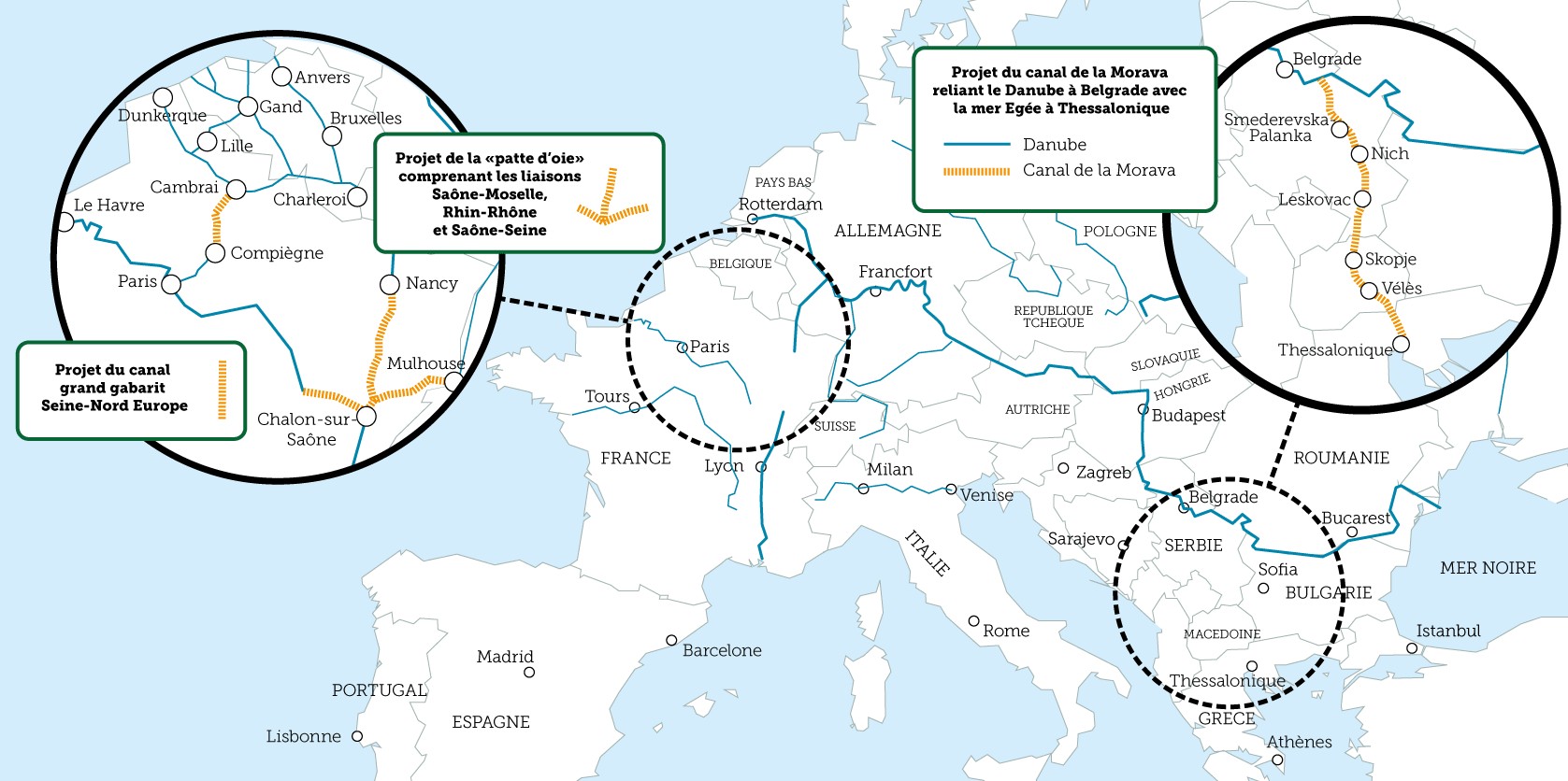 Aujourd’hui, la Chine montre un grand intérêt pour le projet de canal de la Morava qui permettrait de relier la ville de Thessalonique en Grèce au grand couloir de transport fluvial Rhin-Maine-Danube, un raccourci de plus de 1200 km pour les exportations chinoises !