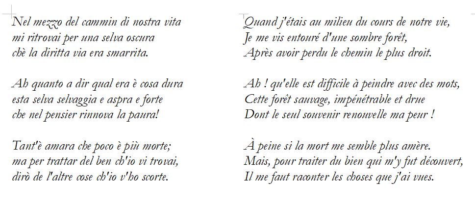 Ce sont les premiers tercets de la Commedia de Dante, où l’on aperçoit déjà la puissance et la musicalité de son langage poétique, et l’utilisation qu’il fait des onomatopées, utilisant des sons qui donnent l’idée du concept, ou du sentiment, qu’il cherche à transmettre. Dans ce cas, la peur, soulignée par les nombreux « r » roulés de « esta selva selvaggia e aspra e forte che nel pensier rinnova la paura. Tant’è amara che poco è più morte » (paura, morte, amara sont la peur, la mort, l’amertume).