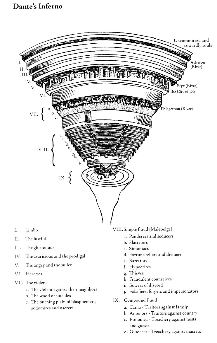 Dans l’Inferno, Dante découvre les grands pécheurs de son temps, dont Boniface VIII, le pape qui l’a exilé, ou encore le comte Ugolin, emprisonné avec ses enfants par un autre membre corrompu de l’Église, et qui a vu ses enfants mourir de faim en prison (épisode que Goethe a qualifié d’un des plus hauts faits de poésie et de tragédie).