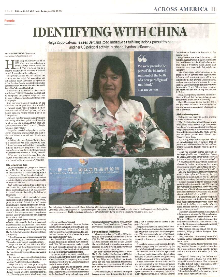 Dans un article de premier ordre publié le 18 août dernier, le correspondant à Washington du China Daily Chen Weihu retrace le cheminement intellectuel et politique de la présidente internationale de l’Institut Schiller Helga Zepp-LaRouche : un combat de toute une vie en faveur des Nouvelles Routes de la soie, devenues la politique officielle de Beijing depuis 2013.