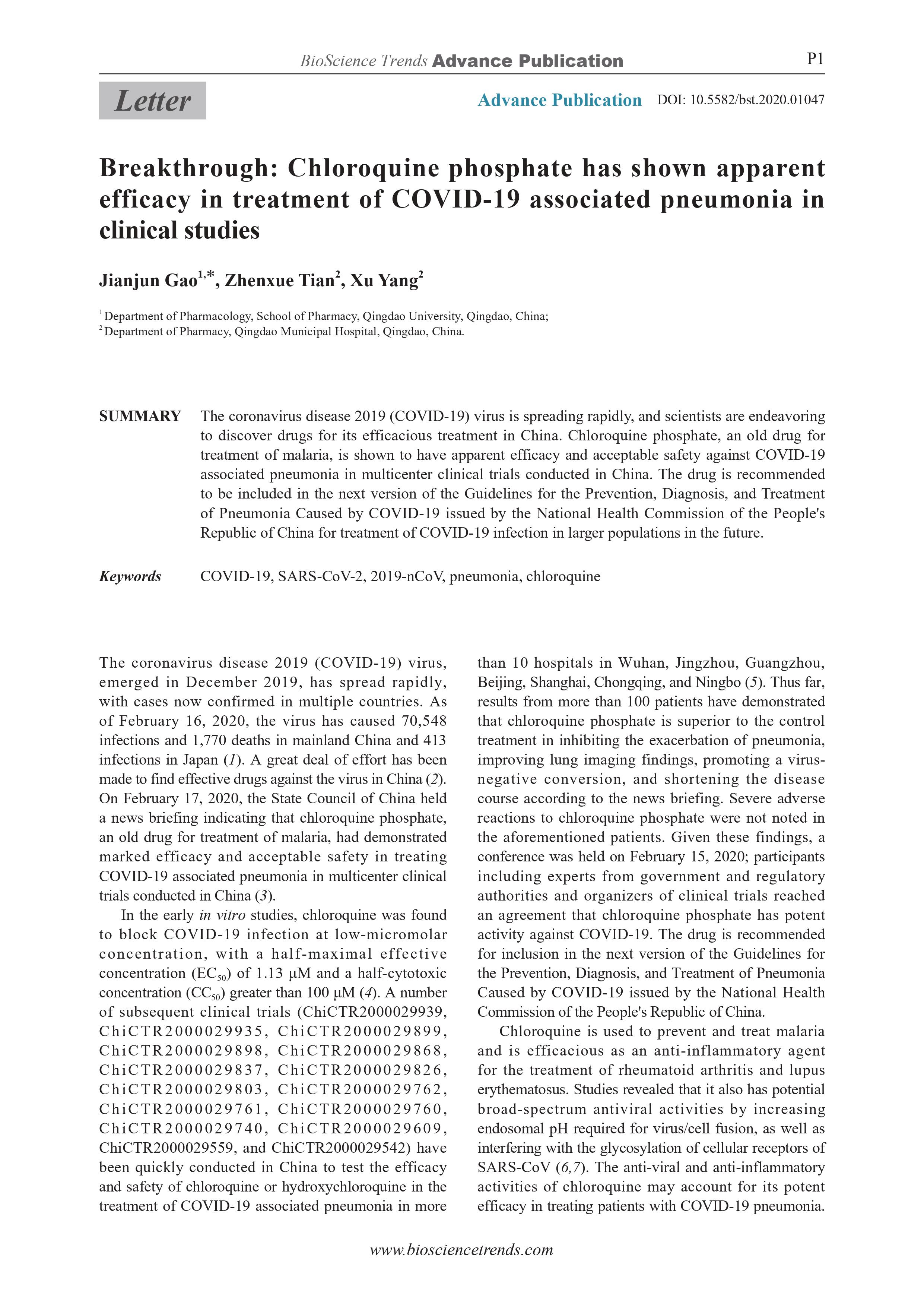 Le briefing de presse du Conseil des affaires de l’Etat chinois a communiqué, le 17 février, sur les résultats des essais cliniques in vivo conduits sur ce médicament par trois chercheurs chinois, Jianjun Gao, Zhenxue Tian et Xu Yang, dans plus de dix hôpitaux à Wuhan, Jingzhou, Guangzhou, Beijing, Shanghai, Chongqing et Ningbo. Les résultats ont été publiés dans la revue BioScience Trends Advance Publication dès le 19 février. Le Conseil conclut que : « Le phosphate de chloroquine, un médicament très ancien utilisé contre le paludisme, a montré lors des essais cliniques conduits dans un certain nombre de cliniques en Chine, une efficacité notable [marked efficiency] dans le traitement de la pneumonie associée au Covid 19. »