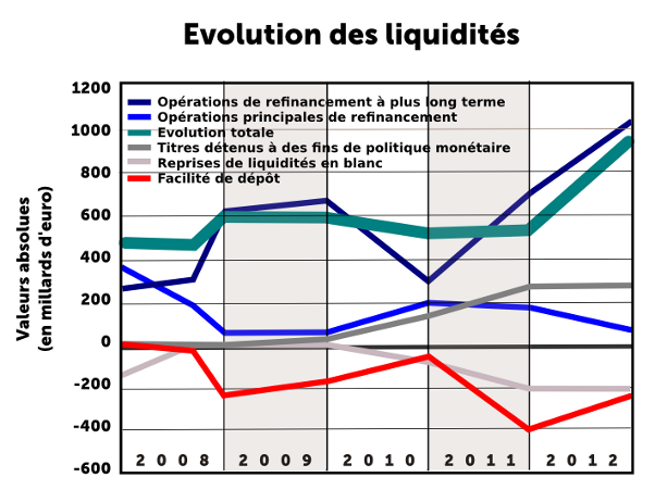 Selon un document officiel de la BCE, avec « l’escalade de la crise en 2008, les opérations régulières ont été complétées par une panoplie de mesures non conventionnelles connues dans leur ensemble comme Politique de soutien renforcé du crédit ». De nouvelles échéances à 12 mois voire jusqu’à 36 mois ont été permises. Et la BCE continue : « Grâce à notre politique de soutien renforcé du crédit, les banques ont pu continuer à assumer un rôle capital dans le financement de l’économie réelle. » Soulignons au passage que le seul fait de mentionner l’« économie réelle » constitue un hommage à notre travail, puisque nous avons été les premiers à insister, depuis de nombreuses années, sur la nécessité de faire la distinction entre les banques qui prêtent à l’économie réelle et celles qui spéculent sur les marchés financiers.