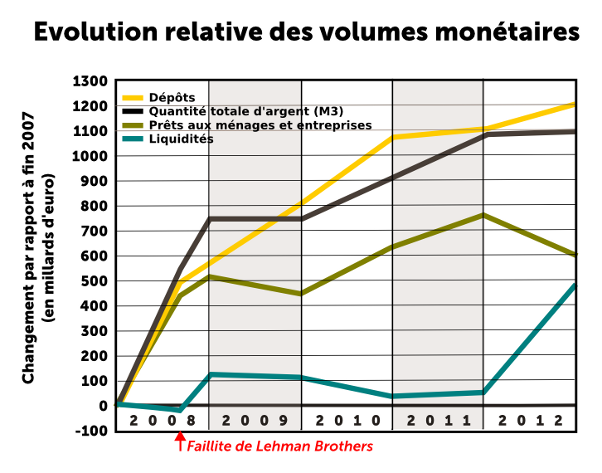 L’année 2012 marque un autre point de rupture : la masse totale d’argent disponible continue certes à augmenter, mais à un rythme bien plus lent, tandis que les liquidités mises à la disposition des banques par la BCE augmentent à un rythme sans précédent.