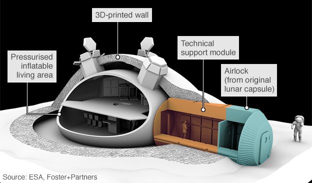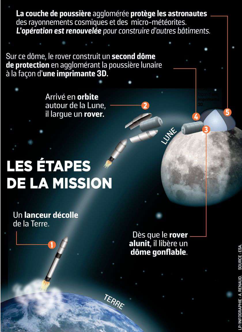 Ensuite, la matière obtenue servirait d’élément de base à des imprimantes 3D qui fabriqueraient les habitations. Thalès pourrait construire les satellites qui assureraient les communications avec la Terre.