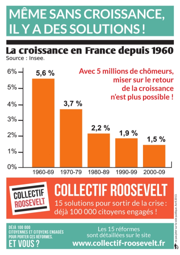 Dans ses tracts, le Collectif revendique des solutions « sans croissance » ! Il s’agirait en effet de créer de l’emploi en passant à la semaine de 4 jours (pas pour les écoliers, hein !) et de lancer un grand plan européen d’économie d’énergie. Avec moins d’énergie et un petit partage du temps de travail restant, on entend relancer le progrès économique et social ? Mais c’est pas du Franklin Roosevelt ça !!