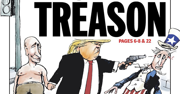 Voici, à gauche, la Une du quotidien (démocrate) new-yorkais Daily News du 17 juillet 2018 qui tire à 700000 exemplaires et qui titre : « Ouvertement de la trahison ».
