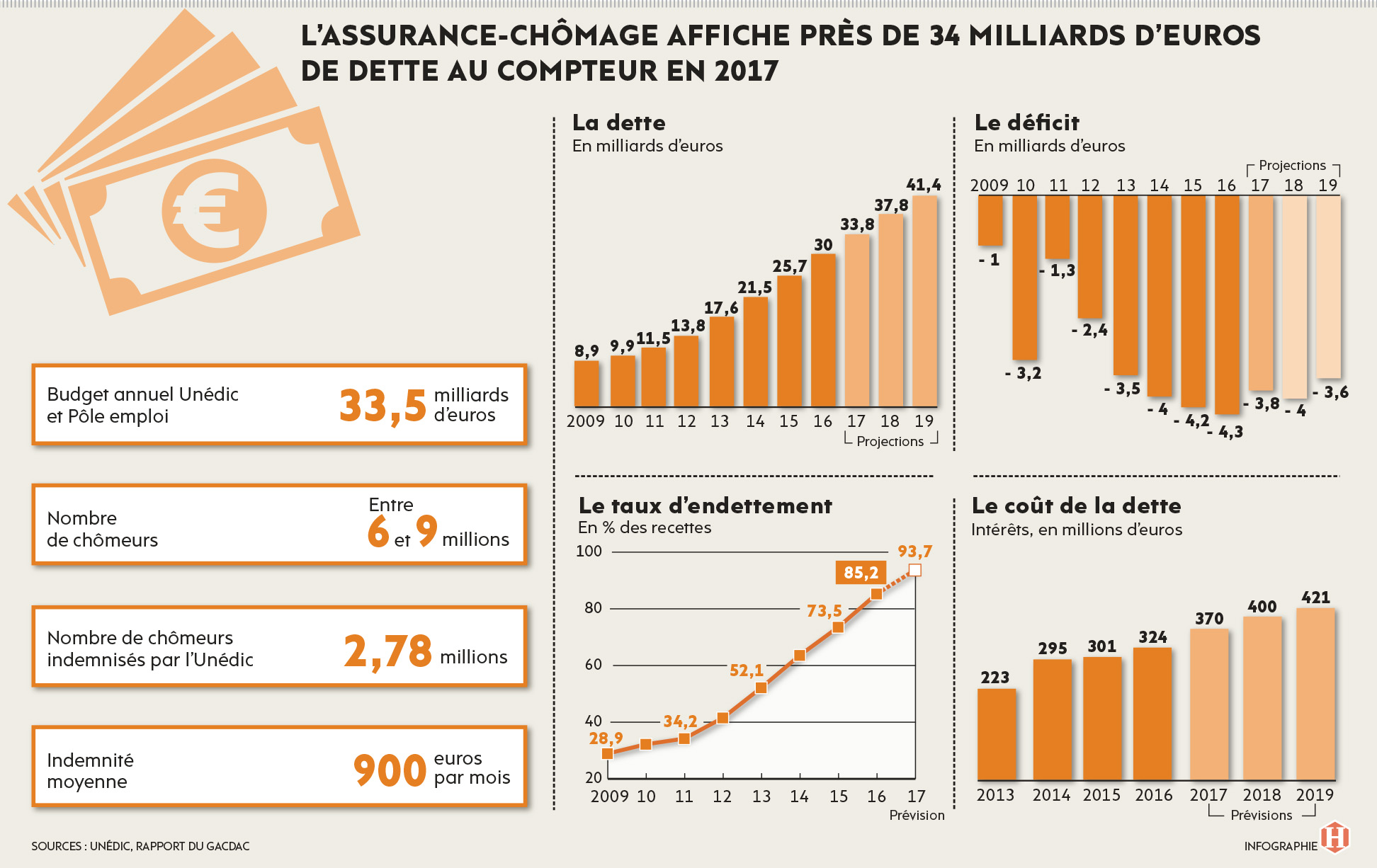 Conséquence directe : une explosion de la dette de l’Unédic, qui devrait passer de 8,9 milliards d’euros en 2009 à plus de 36 milliards fin 2018. Elle aura donc quadruplé en neuf ans. Le montant des intérêts payés aux créditeurs a lui aussi explosé : de 223 millions d’intérêts en 2013 à 400 millions en 2018. Au final, 2 milliards d’euros d’intérêts ont été versés aux créanciers en six ans. Le taux d’endettement de l’Unédic – le montant de sa dette rapporté à ses recettes – est de 93 %.