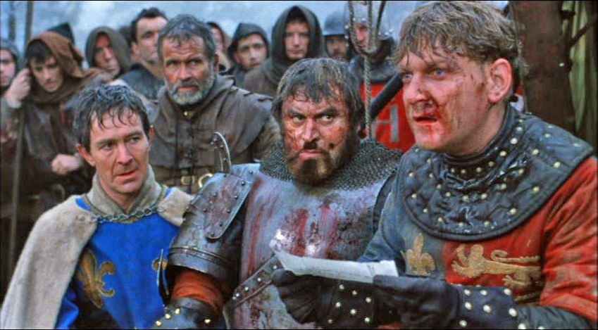 La scène du discours de la Saint Crépin et celles qui suivent sont assez représentatives de l’ensemble du film. Apparemment Branagh doit considérer que le texte de Shakespeare manque de puissance, puisqu’il a cru bon de se faire accompagner d’une musique hollywoodienne qui va crescendo jusqu’à l’apothéose au fur et à mesure qu’il débite le discours. Ceci étant fait, les soldats se mettent en ordre de combat, avec les visages crispés filmés en gros plan – ce qui n’est pas très original mais qui nous rappelle que le cinéma contemporain s’est beaucoup inspiré de Leni Riefenstahl.