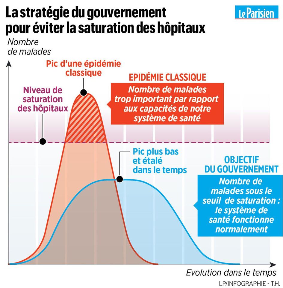 Le graphique du ministre visualise deux scénarios. Dans le premier, la courbe du « pic épidémique classique » (courbe rouge) dépasse de loin le « niveau de saturation des hôpitaux », représenté par une ligne droite horizontale immuable. Ce dépassement produira « un nombre de malades trop important par rapport aux capacités de notre système de santé ».
