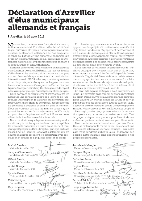 Nous autres, maires et élus français et allemands, réunis ce samedi 10 août à Arzviller (Moselle), dans l’esprit du Traité de l’Elysée en son cinquantième anniversaire, déplorons la défaillance de nos dirigeants, incapables d’affronter une oligarchie financière qui promeut le démantèlement social, bafoue nos souverainetés nationales et impose une politique menant à la dépopulation à l’échelle mondiale.