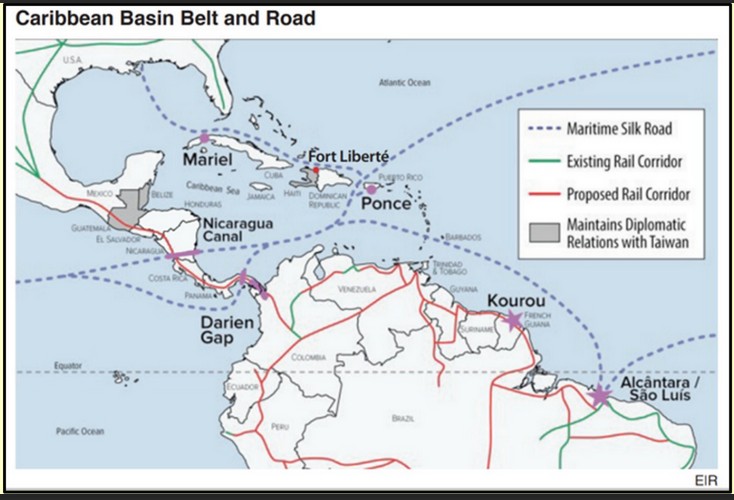 Le Venezuela jouerait un rôle essentiel dans ce projet. Il serait relié aux ports en eau profonde de Ponce (Porto Rico), de Mariel (Cuba) et à la côte est des États-Unis. Le développement du réseau ferroviaire à grande vitesse traverserait toute l’Amérique centrale jusqu’au Mexique, puis les États-Unis, le Canada, l’Alaska et le tunnel sous le détroit de Béring, pour rejoindre l’initiative « la Ceinture et la Route » eurasienne. L’ensemble de ces projets créerait les conditions d’une croissance économique réelle et substantielle, tout en générant une forte création d’emplois productifs.