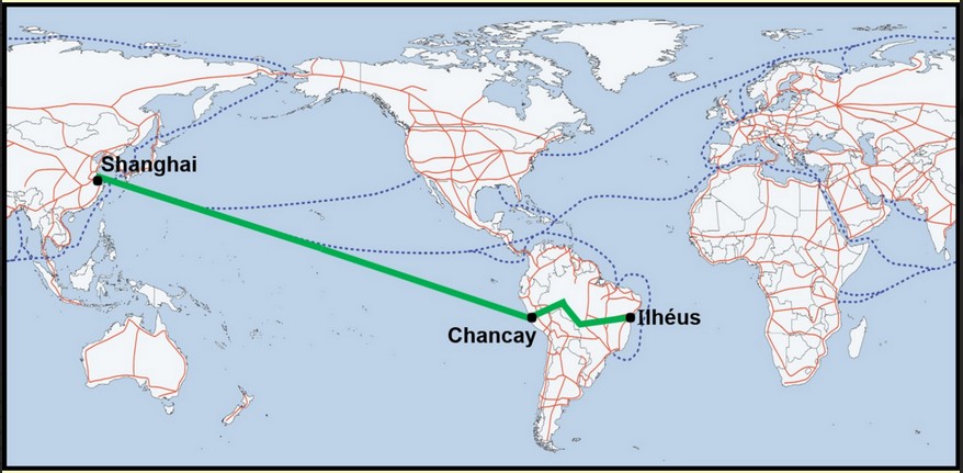 Le port de Chancay, au Pérou, développé conjointement par la Chine et le Pérou, apparaît sur la carte. Il accroît considérablement la productivité du transport transpacifique vers Shanghai et d’autres ports asiatiques. La construction d’un réseau ferroviaire transaméricain, reliant Chancay à Ilhéus au Brésil, est actuellement à l’étude.