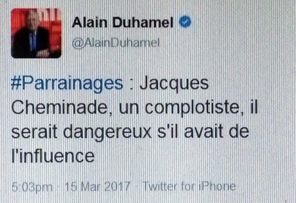 Son comparse, l’autre dinosaure des commentateurs Alain Duhamel, le 15 mars, donc à quelques jours avant la validation de la candidature de Cheminade par le Conseil constitutionnel le vendredi 18 mars, mettait lui aussi en garde via twitter :
