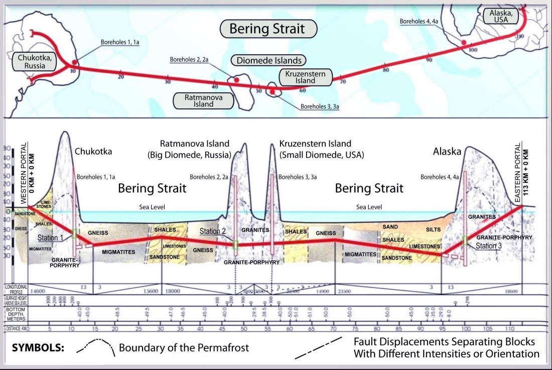 Aujourd’hui, les deux continents sont séparés par le détroit de Béring (82,5 km), au milieu duquel, deux petites îles distantes de 3,8 km : côté russe, la grande Diomède, et côté américain, la petite Diomède. La profondeur du détroit ne dépassant pas les 55 mètres, comparable à la Manche, ce projet se résume, en gros, à deux fois le tunnel reliant la France au Royaume-Uni.