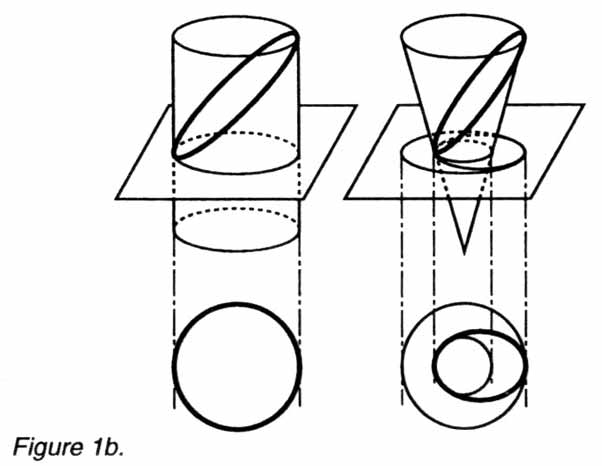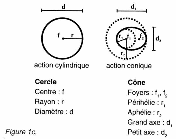 L’action cylindrique et l’action conique se différencie fondamentalement par le passage d’une singularité à deux singularités (figure 1c) : le cercle a un centre alors que l’ellipse a deux foyers ; le cercle a un rayon de longueur toujours égale alors que celui de l’ellipse varie en longueur avec un minimum (périhélie) et un maximum (aphélie) ; le cercle a un diamètre alors que l’ellipse possède un grand axe et un petit axe.