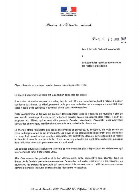Cette mobilisation va trouver un premier développement avec la rentrée en musique afin de marquer de manière positive le début de l’année dans les écoles, les collèges et les lycées. Il s’agit de proposer aux élèves, qui étaient déjà présents l’année précédente, d’accueillir leurs nouveaux camarades en musique, manière chaleureuse de leur souhaiter la bienvenue.