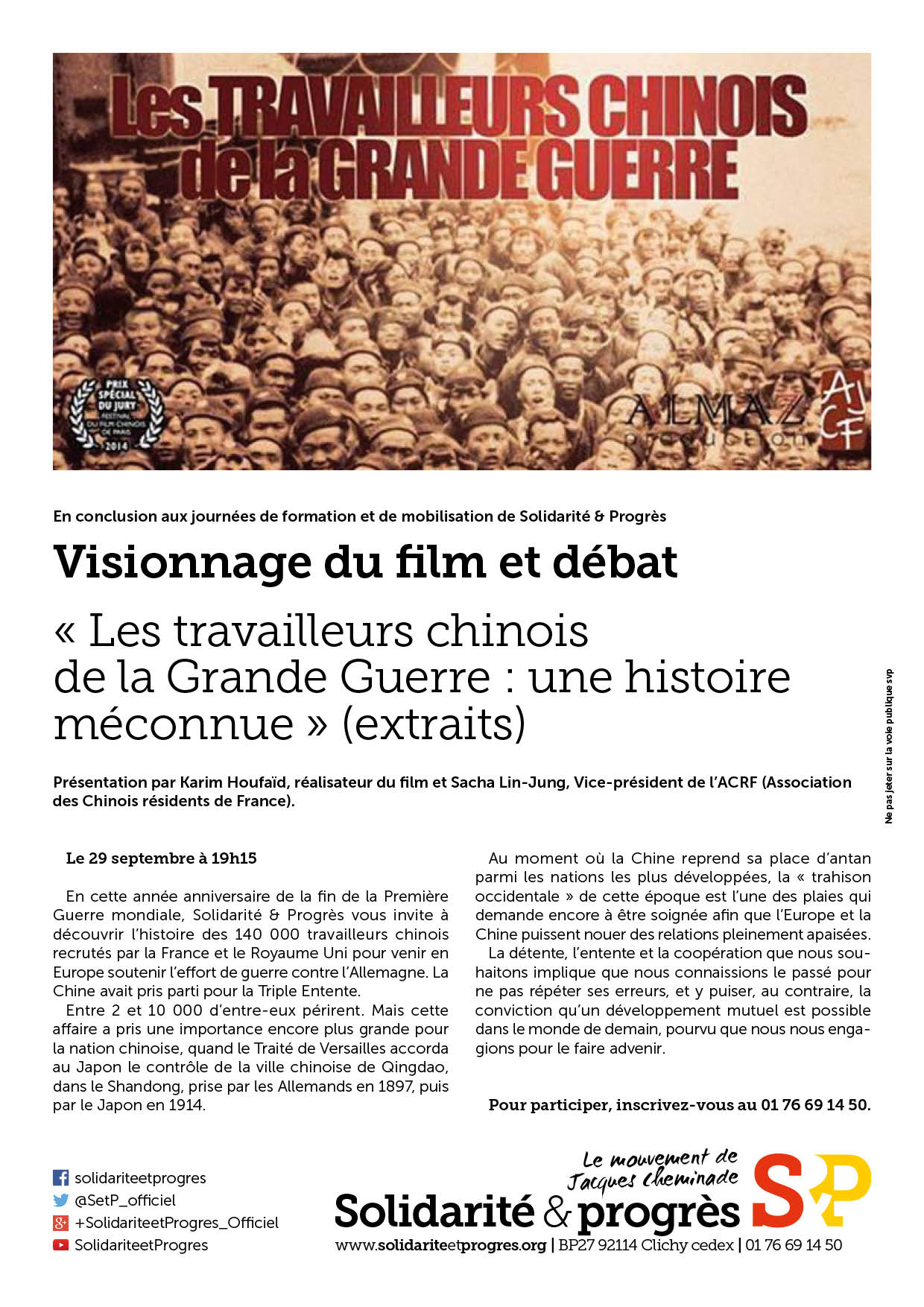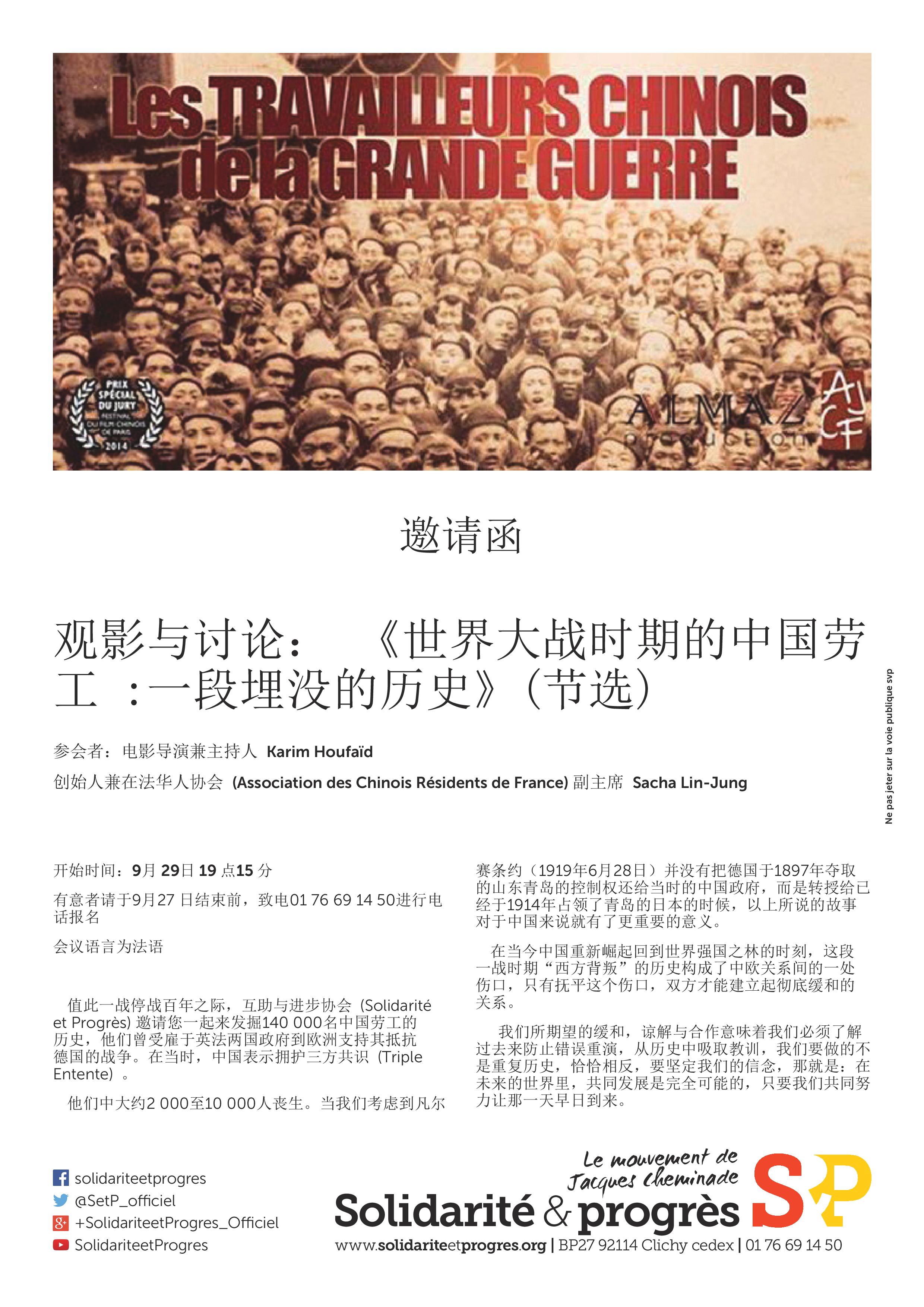 Dans le cadre de ses Journées de formation, les 28 et 29 septembre 2018, Solidarité & Progrès organise un visionnage d’un extrait important du film « Les travailleurs chinois de la Grande Guerre ».