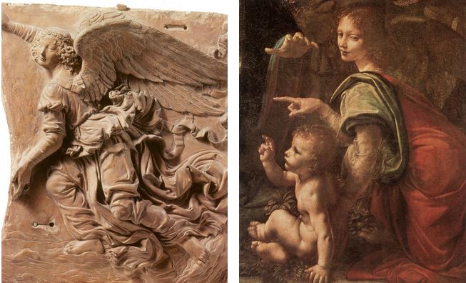 En feuilletant le catalogue de cette exposition, ma joie fut grande en découvrant (et à ma connaissance, personne avant moi ne semble l’avoir remarqué) que l’image de l’ange énigmatique qui rencontre l’œil du spectateur dans le tableau de Léonard intitulé La Vierge aux rochers (1483-1486) (Louvre, Paris), à part sa posture plus posée, n’est grosso modo qu’une « citation visuelle » d’un haut-relief en terre cuite (Louvre, Paris) réalisé, nous dit-on, par « Verrochio et un assistant ». L’hypothèse qu’il s’agisse de Léonard en personne est plus que tentante, étant donné sa présence comme apprenti auprès du maître !