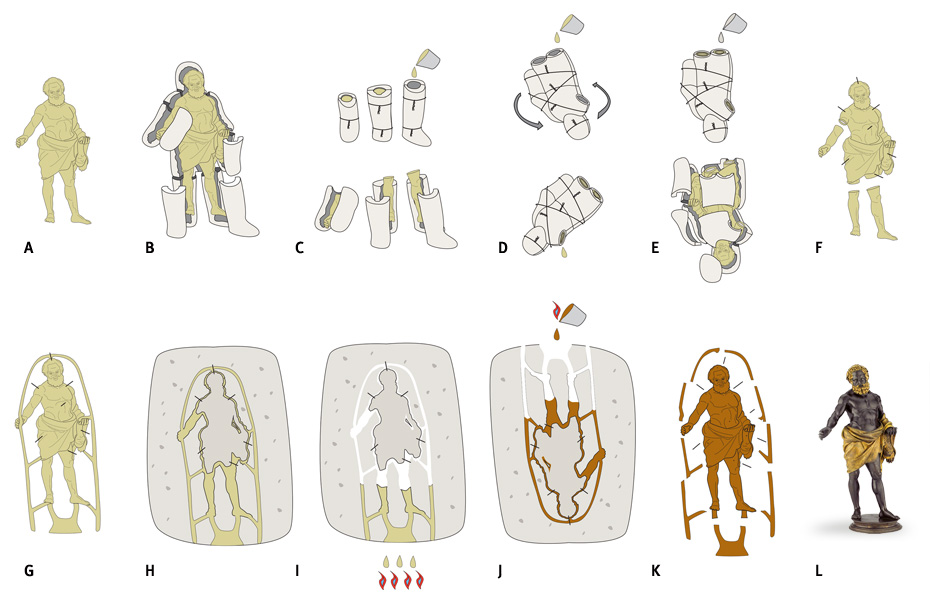 Elle consiste à confectionner d’abord un modèle en terre réfractaire (A), recouvert d’une épaisseur de cire correspondant à l’épaisseur de bronze recherchée (B). Ce modèle est ensuite recouvert d’une épaisse couche de plâtre qui, en se solidifiant, forme un moule extérieur. En pénétrant dans ce moule par des tiges prévues à cet effet (J), le bronze en fusion va se substituer à la cire. Enfin, une fois le métal solidifié, on brise le revêtement (K). Reste alors à affûter les détails et polir l’ensemble selon le choix de l’artiste (L).
