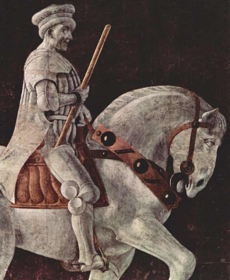 Si cette perspective est quelque peu surréaliste et la pose du cheval, levant les deux jambes du même côté, tout simplement impossible, il n’en demeure pas moins que la fresque d’Uccello va fixer les normes de l’image idéale et impassible de la vertu et du commandement que doit incarner le héros de la Renaissance : son but n’est plus de « gagner » la guerre (objectif du mercenaire), mais de préserver la paix en prévenant tout conflit (objectif d’un roi-philosophe ou simplement d’un chef d’État avisé, pour qui la prospérité du royaume se mesure en termes du nombre de ses sujets et de leur prospérité).
