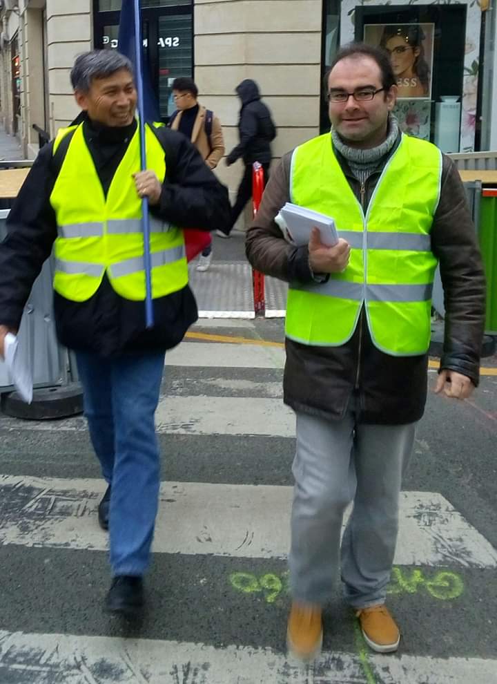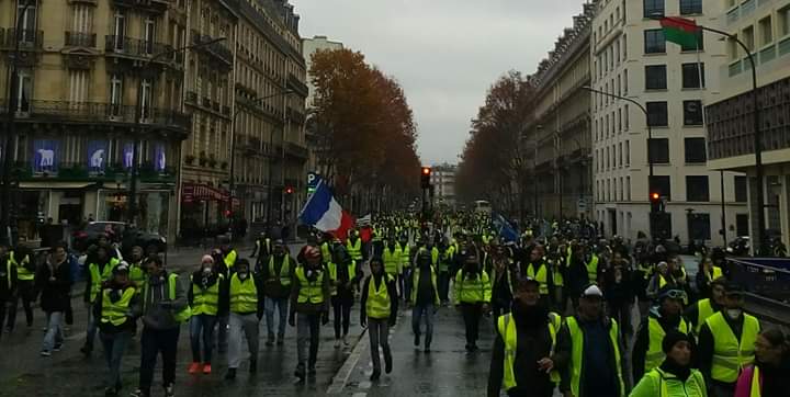 Beaucoup de gens qui passaient sans participer témoignaient de leur soutien. Notre petit groupe qui distribuait notre tract (écoulé en moins de temps qu’il faut pour dire anticonstitutionnellement ;-) a notamment été abordé par un retraité, ancien cadre supérieur dans l’industrie et qui n’est donc pas dans la galère. Il disait son soutien au mouvement et à la cause, mais aussi sa colère de voir qu’aujourd’hui l’industrie court après l’argent et non plus à servir le développement industriel et le travail, avec des patrons qui gagnent des sommes astronomiques alors que le travailleur a des fins de mois difficiles. Entrant dans un restaurant pour reprendre des forces, des clients nous interpellent “Merci pour ce que vous faites, vous œuvrez pour nous et nos enfants”. » Le chiffre avancé dans la journée de 5000 manifestants à Paris semble ubuesque à nos militants franciliens. « Je dirais trois fois plus de gilets jaunes que samedi dernier », se risque l’un d’eux. Deux Paris se dessinent : ceux des casseurs, ceux qui se laissent entraîner dans la violence, et celui des bavures policières, d’un côté, et ceux qui veulent comme nous que le pouvoir reconnaisse que le vrai état d’urgence, c’est l’urgence sociale, des citoyens non-violents et déterminés, d’un autre côté. Notons enfin que notre équipe n’a pas croisé de journalistes - semble-il plus intéressés à filmer les casseurs plus loin...