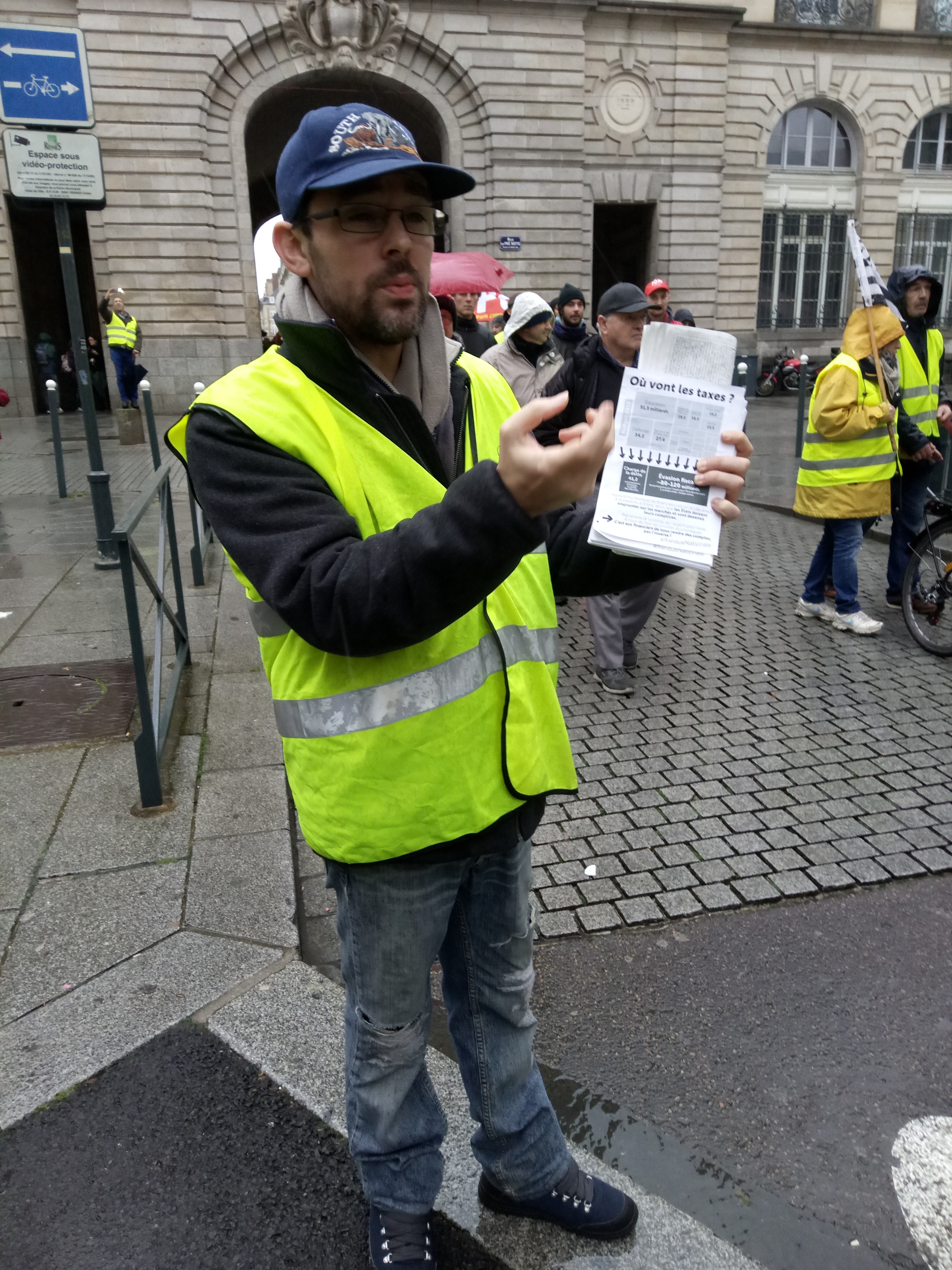 Rennes : environ 500 personnes ont défilé dans les rues de Rennes ce samedi pour une « marche solidaire ». Alexis et Yannick, sympathisants rennais de SetP étaient présents. Ambiance convergence des luttes : des syndicalistes CGT, FO, des politiques FI, LO, PCF, des apolitiques, des UPR, quelques RN se disant apolitiques... Nous étions les seuls à avoir un tract (celui avec notre proposition de banque nationale et de lutte contre l’évasion fiscale [80 à 100 milliards par an]). Nous avons fait un carton avec la question de l’évasion fiscale ! 200 tracts distribués rapidement, surtout aux non-manifestants, aux abords du cortège. Beaucoup de soutien de la population rennaise mais aussi quelques personnes qui recrachent l’équation médiatique gilets jaunes = fachos ou qui reprochent aux gilets jaunes « de se réveiller que maintenant ». Il faut rester calme, dialoguer avec eux et leur expliquer que c’est une caricature. Malgré tout, une volonté ici des gilets jaunes d’affirmer l’unité du peuple (tous citoyens, tous concernés) et d’empêcher les débordements comme les discussions trop clivantes. Par ailleurs, bon nombre de gilets jaunes se posent ici les bonnes questions : « Macron démission n’est pas un slogan réaliste, c’est un cul de sac pour le mouvement » , « C’est bien de manifester, mais cela ne suffira pas à faire changer les autistes qui sont au pouvoir », « Comment rallier le reste de la population ? », « Les blocages sont-ils la meilleure chose à faire ? », « Il faut que l’on se structure et que l’on ait une communication plus efficace et unie » , « Quelle suite donner au mouvement ? »... Bouts de discussions, attrapés ici ou là : une dame gilet jaune qui nous raconte que sa fille au collège lui demande un soir si les gilets jaunes, c’est un mouvement de racistes. La collégienne l’a entendue de la bouche d’amis qui le tenaient de leurs parents... Un retraité à 920 euros par mois dont le fils est gilet jaune à Paris nous dit avec fierté que son fils a protégé, samedi dernier, une vitrine brisée de Dior sur les Champs Elysées, avec d’autres gilets jaunes, pour empêcher les pillages.