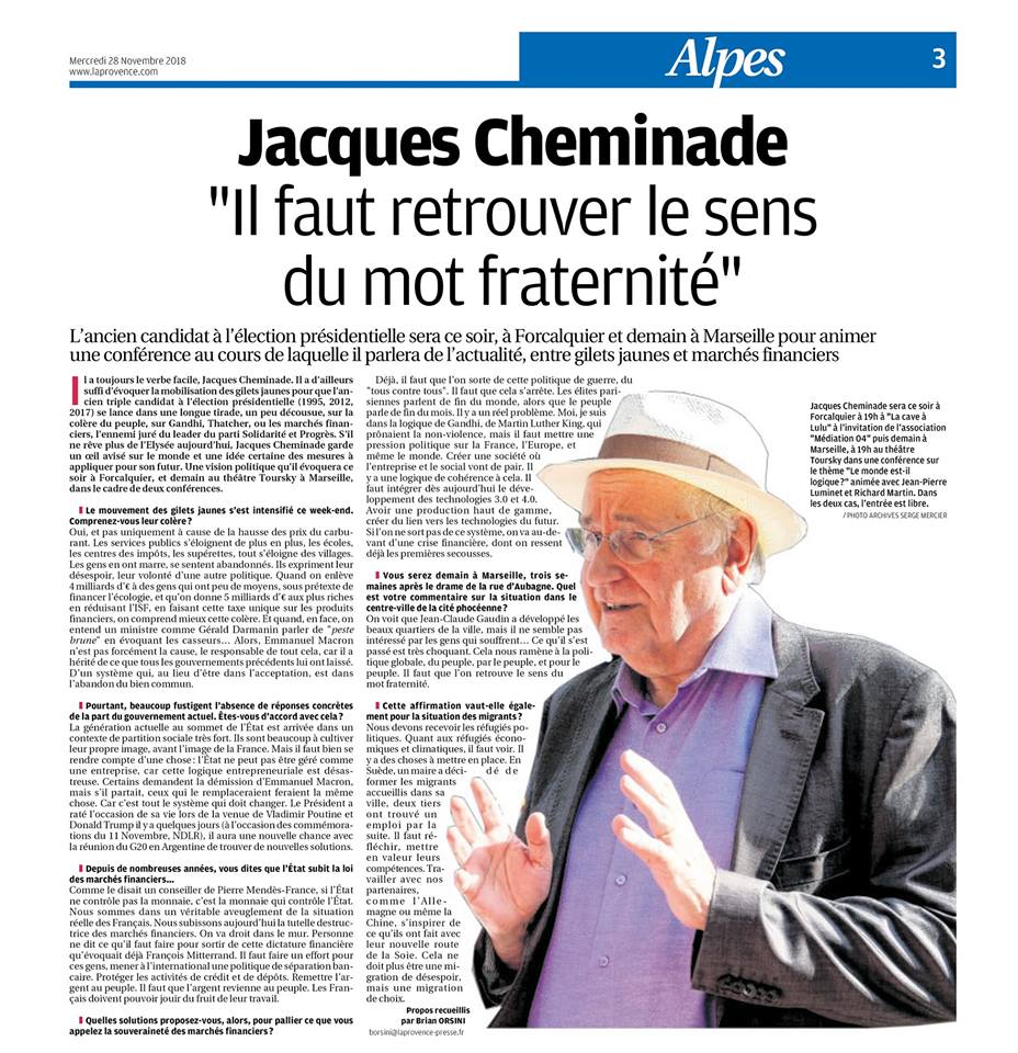 - 29 novembre : conférence à Marseille au théâtre international Toursky avec Jacques Cheminade, Jean-Pierre Luminet (astrophysicien, directeur de recherches au CNRS) et Richard Martin (directeur du théâtre, metteur en scène, auteur et comédien) devant plus de 90 personnes. Le thème Le monde est-il logique ? a été l’occasion pour les intervenants d’aborder la question de la culture en lien avec l’actualité. Les gilets jaunes ont-ils raison ? La finance est-elle imbattable ? La science peut-elle être humaniste ? L’intelligence artificielle est-elle intelligente ? Les médias cherchent-ils à enfumer le peuple ? La fraternité créatrice est-elle la solution à la crise ? D’où vient la créativité ? Quel rôle doit jouer la culture dans le changement de paradigme actuel ? Les poètes ont-ils leur place en politique ?... Deux heures d’échanges avec la salle.