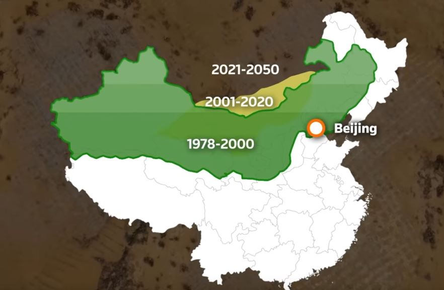 Ce résultat est le fruit d’une longue bataille. En novembre 1978, le Comité central du Parti communiste chinois (PCC) et le Conseil d’État avaient décidé de lancer un projet sur 72 ans (1978-2050) pour lutter contre la désertification, appelé « Programme des trois brise-vent nord » (Three North Shelterbelt Program – TNSP).