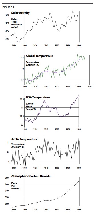 Ceci s’observe sur des mesures de la température moyenne aux États-Unis, de la température moyenne en Arctique, ainsi que de la température moyenne globale, comparées aux changements de l’activité solaire.