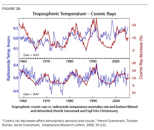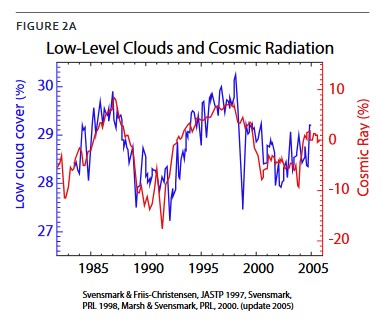 Svensmark et ses associés ont montré qu’un changement de quelques pourcents dans la basse couverture nuageuse (attribuable au changement du flux de rayonnement cosmique) pourrait être responsable de la moitié du réchauffement terrestre au siècle dernier.